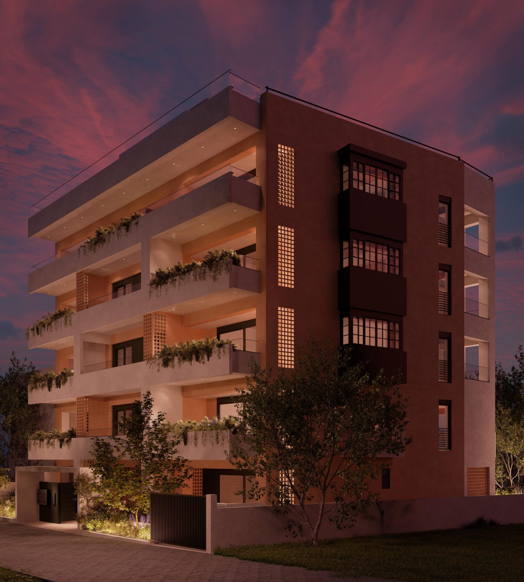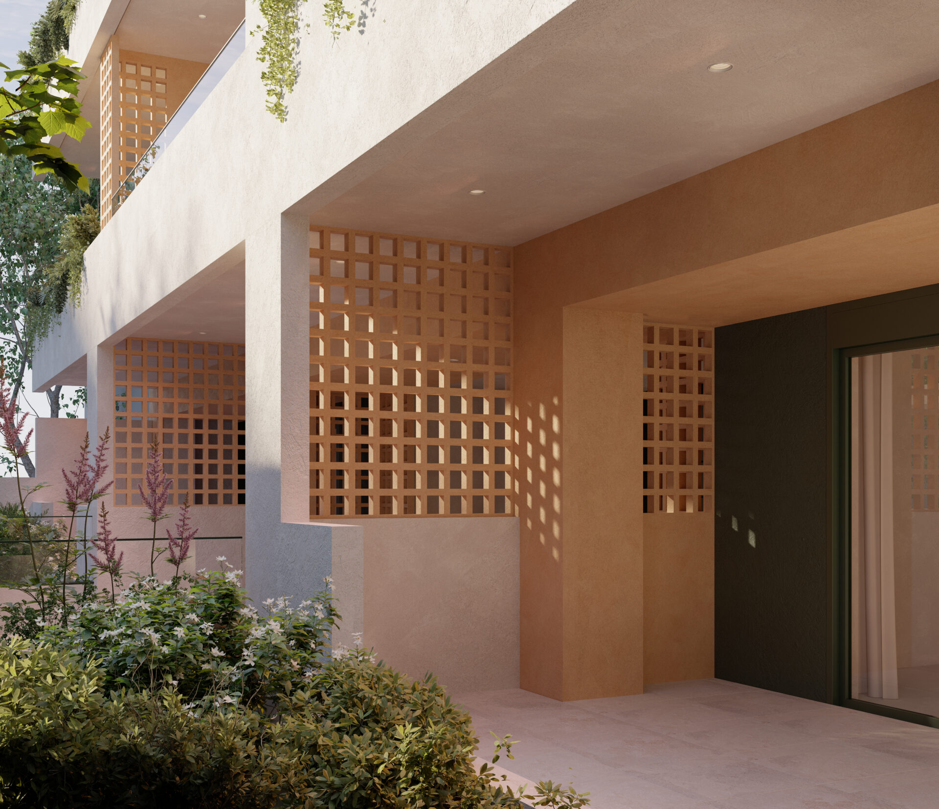 The Mediterranean architecture of this project speaks through the terracotta Cuadrada tiles, the smell of lavender from the balconies, the green roof with the pergolas on top floor and the citrus trees in the garden of the plot.